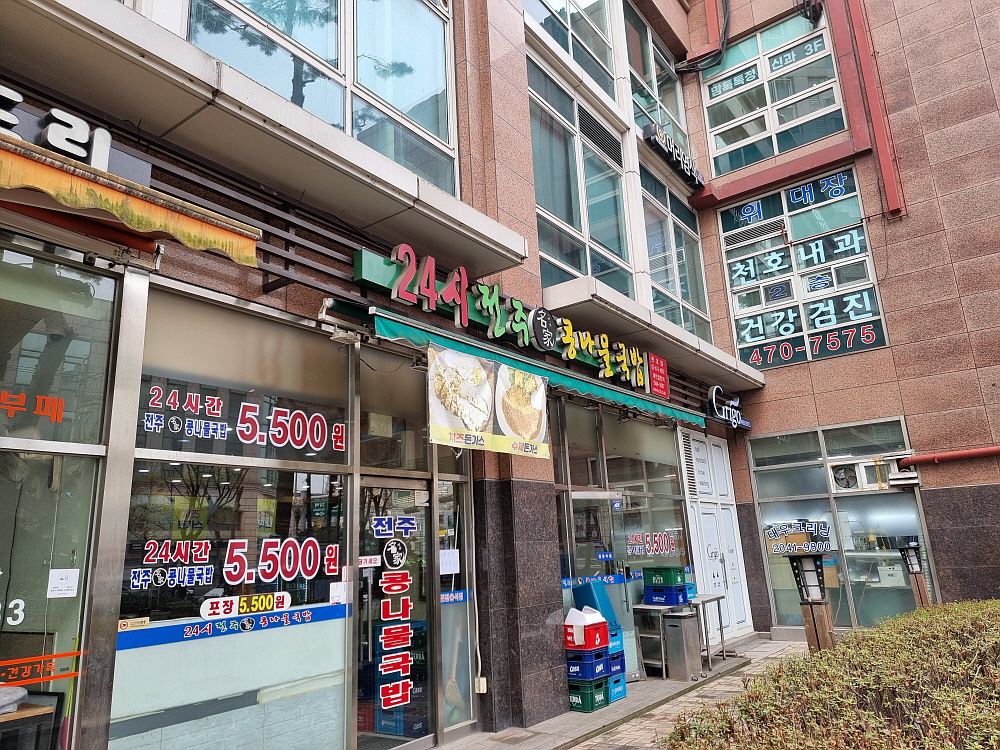 토요일 아침 9시면 그렇게 이른 시간도 아니지만 이상하게도 길거리에 사람들이 없었다. 과연 휴일에 다들 늦잠모드가 되는가 보다. 문을 연 식당을 찾는 것이 급선무인데 낯선 동네에서 휴일 아침에 문을 연 식당을 찾는다는 것이 생각보다 쉬운 일이 아니다. 더구나 차는 어딘가에 주차를 해야 하지 않겠는가? 그렇게 두 어 바퀴 돌다 이집을 발견했다. 커다란 상가건물 1층에 있는 콩나물국밥집인데 상가 지하주차장도 보이기에 망설이지 않고 들어갔다. 그런데 이 건물의 지하주차장은 아마도 오피스텔 입주자 편의 때문인지 상가 주차장은 지하4층에 있다. 얼마나 뱅글 뱅글 돌아 내렸갔는지 어지러울 정도였다.