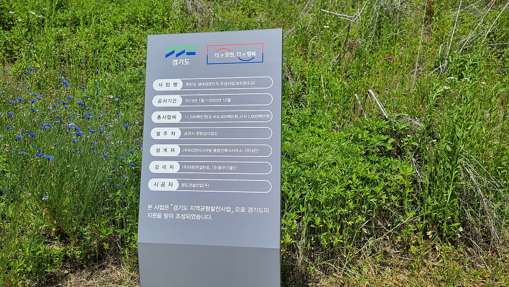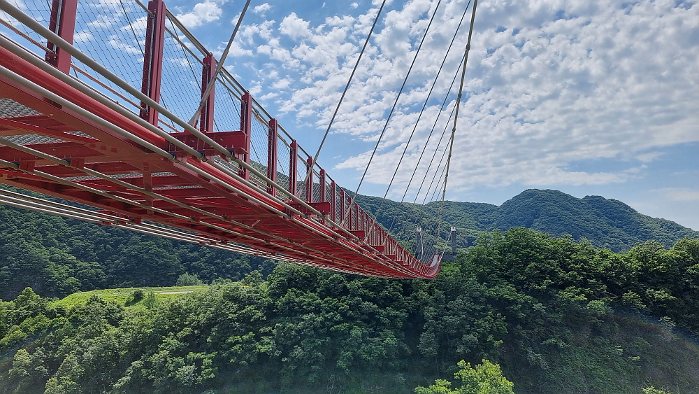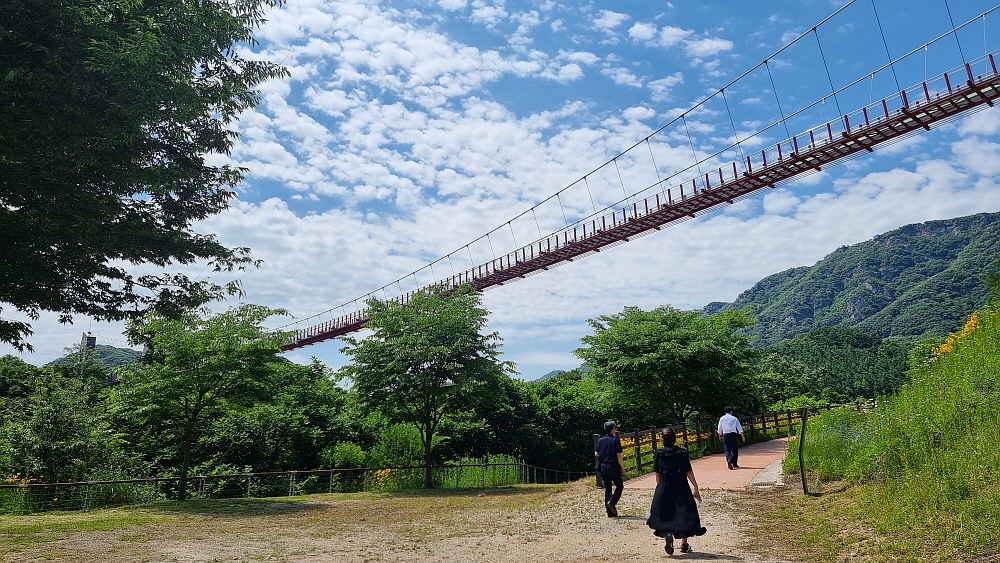 어쨌든 이제 올 해 말이면 구라이골의 이 아름다운 비경을 한참 걷지 않고도 가 볼 수 있게 될 것이다. 구라이골을 옆으로 두고 새로 만든 현수교, 나름 출렁다리를 걸어 본다. 이 다리도 지금처럼 사람들이 건널 수 있게 개통 된지 얼마 되지 않았다. 112억이라는 많은 예산이 들어간 다리다. 길이나 생긴 모양이 비둘기낭의 하늘다리와 아주 비슷하다. 형제지간 같다. 아직 정식으로 준공식을 한 다리가 아니기 때문에 이름이 그냥 도보현수교라 되어있다. 하지만 이런 멋진 다리라면 그럴싸한 이름 하나 정도는 붙여주는 것이 예의일 것이다.