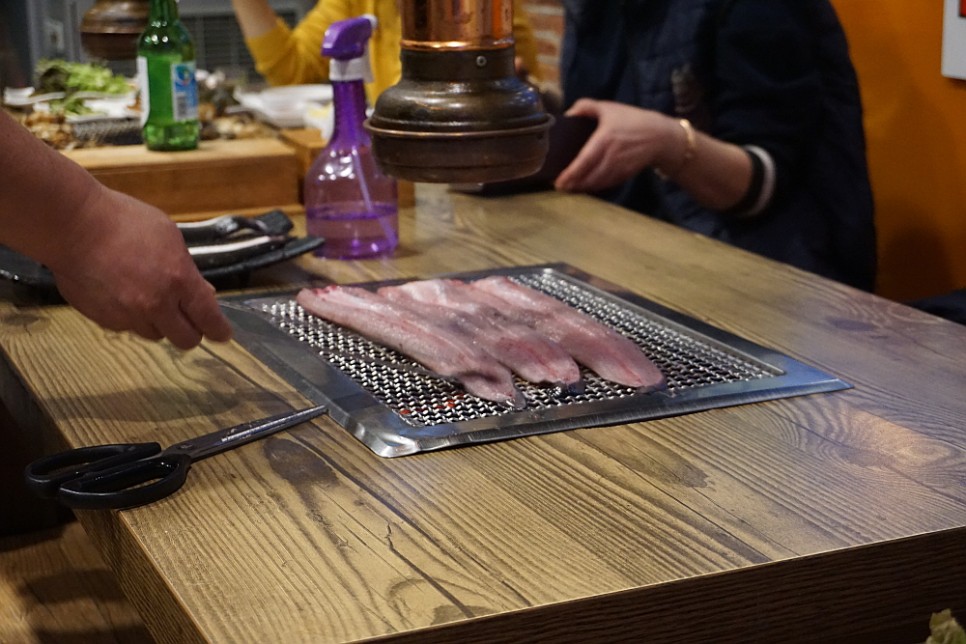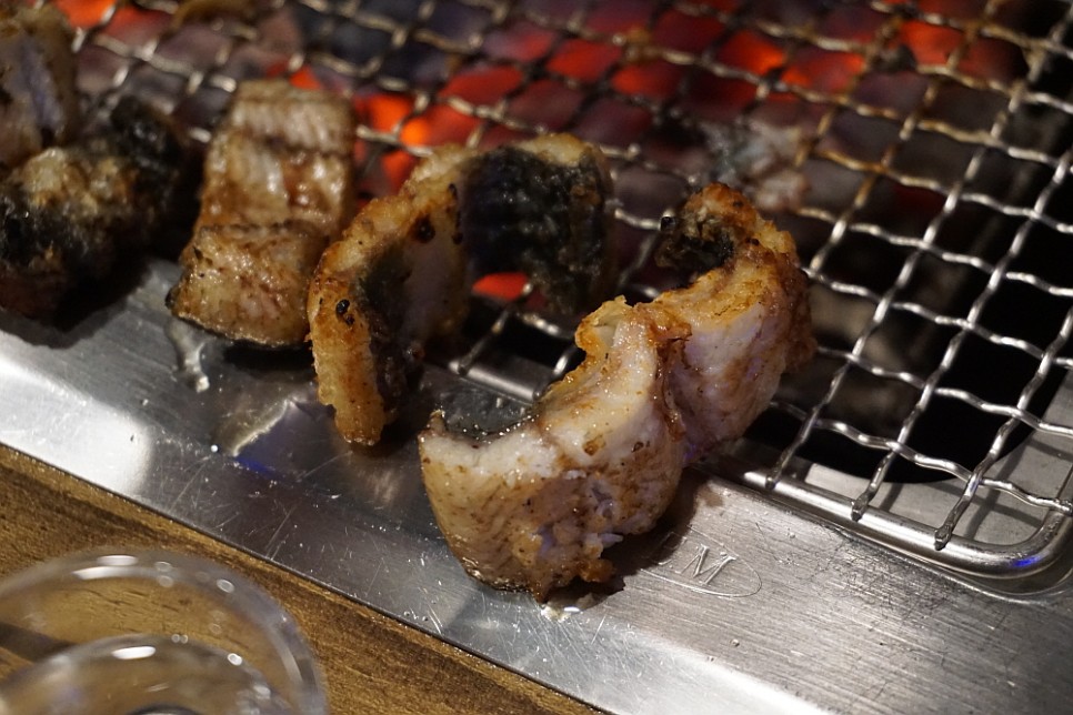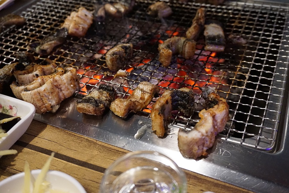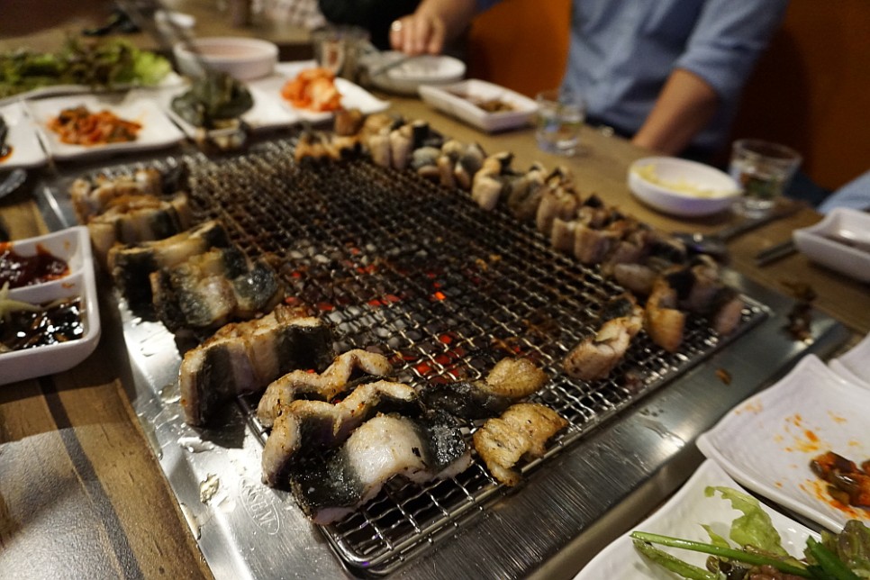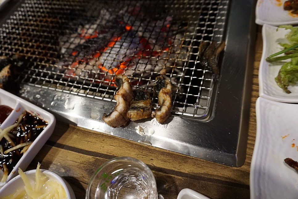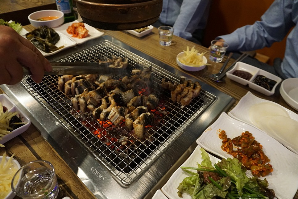 여러 밑 반찬이 나오고, 숯불도 제대로 된 시뻘건 참숯이 등장했다. 요즘은 제대로 된 숯을 구하는 것도 어렵다 했다. 싸구려 중국산 숯은 많지만, 제대로 된 우리나라 참숯은 많지 않다는 것이다. 이 식당이 비록 조금 작긴 하지만 장어라는 고급진 음식을 먹기에 숯 하나라도 제대로 된 국산 것을 쓰고 싶다는 주인장의 마음이 참 고맙다. 어느 정도 장어가 익을 때까지 초벌로 구워 주기 때문에 우린 적당히 밑반찬으로 술 한 잔 찌끄리며 기다리면 된다. 이런 시스템은 대부분의 장어집이 대동소이 하지만 왠지 우리 테이블이 아니라 옆에서 구워주니 그 정성이 더한 느낌이다. 물론 초벌하는 동안에도 우린 전혀 방해받지 않고 대화를 이어갈 수 있다.