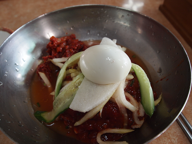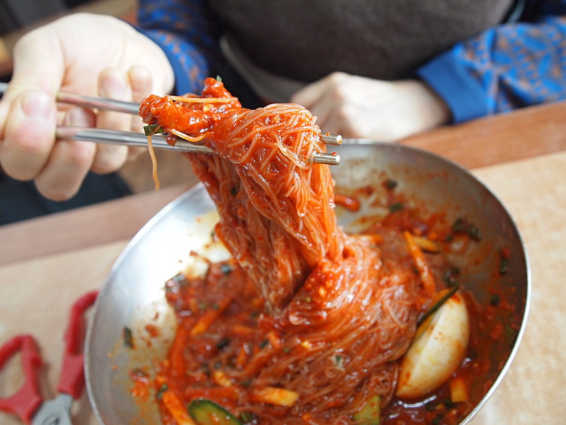 분명 없어진 동천면옥과는 뭔가 관계가 있는 집이라는 생각이 들었다. 형제지간 이거나 집안이거나 아무튼 이렇게 똑 같은 비주얼은 나오기 힘들기 때문에 기술을 이전한 것이 분명했다. 맛을 보니 그런 생각이 더 강하게 들었다. 분명 비슷한 맛이었다. 물론 이집이 더 깊은 내공이 있었다. 하긴 동천면옥도 맛이 훌륭했었다. 마눌의 회냉면에 들어간 가자미의 간이 좀 신맛이 강했다는 점은 아쉬운 부분이지만 그래도 건더기도 많고 맛이 좋았다. 함흥냉면의 면은 정말 쫄깃한 것이 특징이다. 평양냉면과 가장 큰 차이를 보이는 부분일 것이다. 도저히 내 이빨로도 그냥 끊어 먹기가 쉽지 않았다. 냉면을 좋아하는 사람들 중에는 냉면에 가위질을 하는 것을 무슨 큰 잘못이라도 하는 것처럼 생각하는 사람들도 있지만 수월하게 먹기 위해 우리는 과감하게 가위질을 했다.