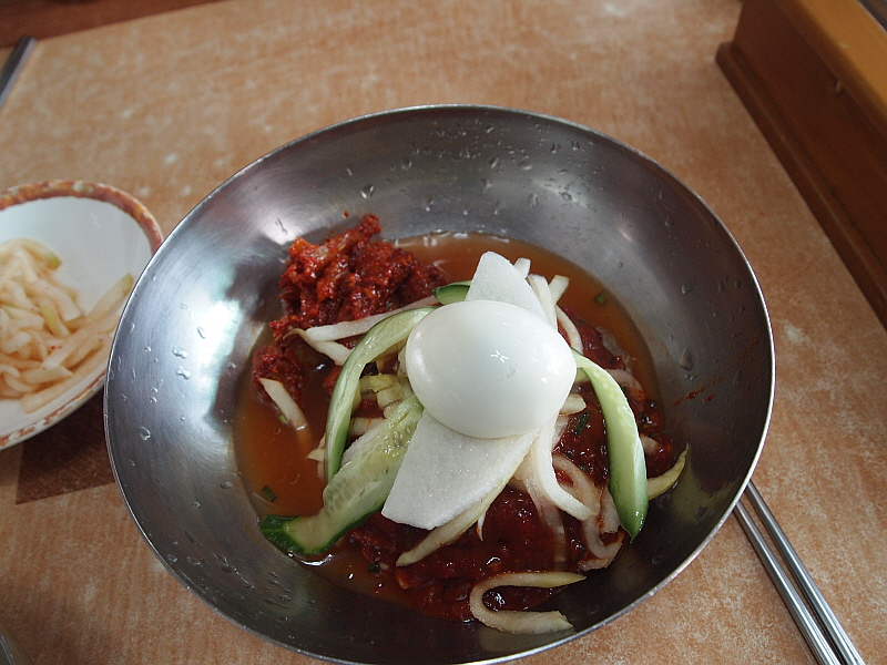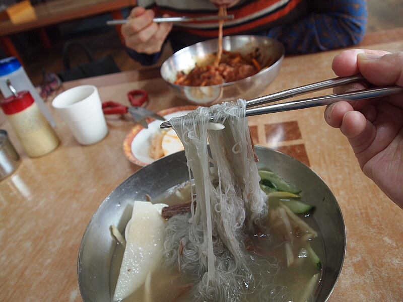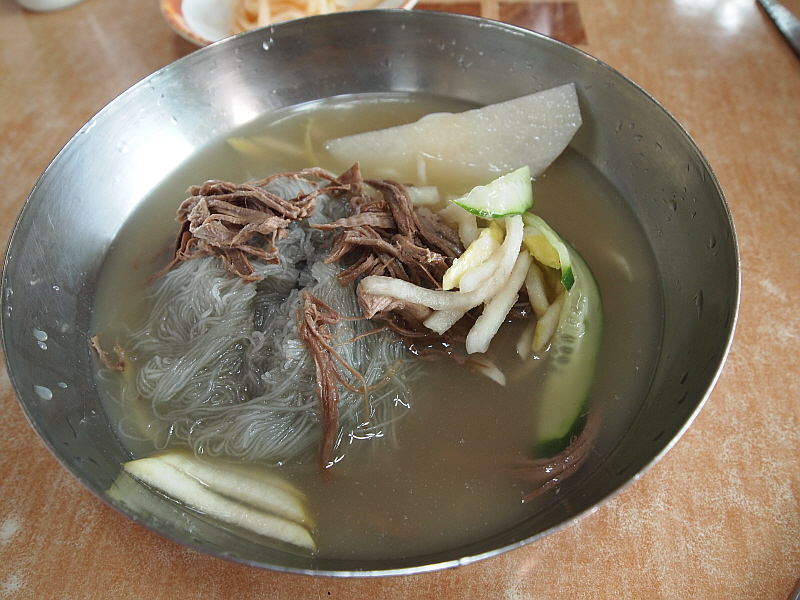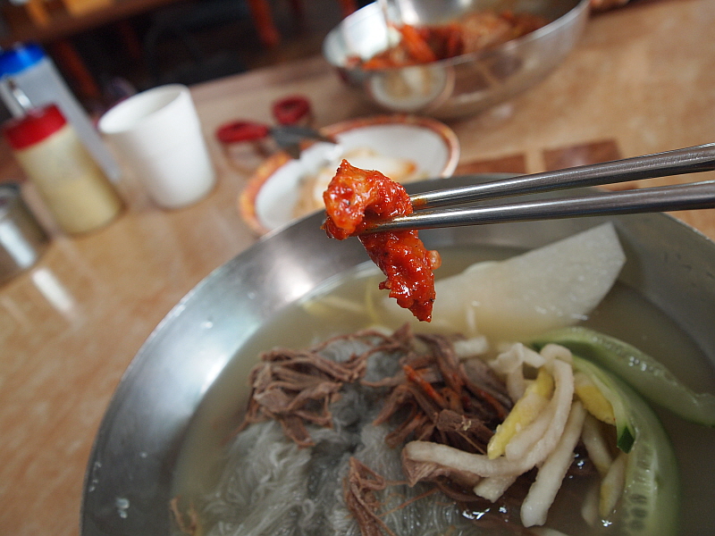 특히나 내 물냉면은 차가운 육수에 쫄깃한 면이 담겨 있어 더 심하게 질겼다. 아무리 젖가락으로 휘휘 저어도 도무지 이 면발이 풀릴 생각을 하지 않았다. 어쩔 수 없다. 그냥 도구의 힘을 빌려야 한다. 물냉면의 육수는 정말 훌륭한 것이었다. 아마 내가 먹어본 함흥냉면 집 중에서는 정말 다섯 손가락 안에 들 정도로 내공있고 깊은 맛이 나는 육수였다. 아마도 소고기와 동치미를 섞은 것 같은데 그 맛이 정말 전문가의 손길이 느껴지는 것이었다.