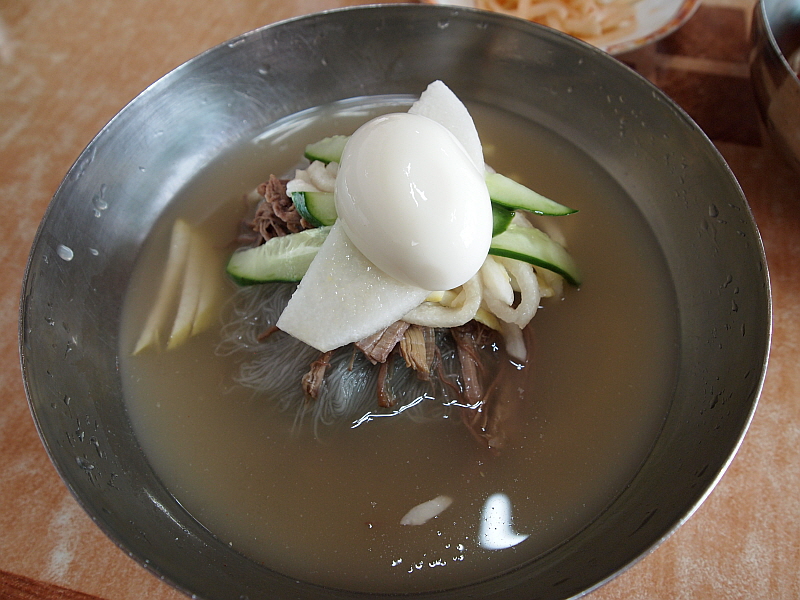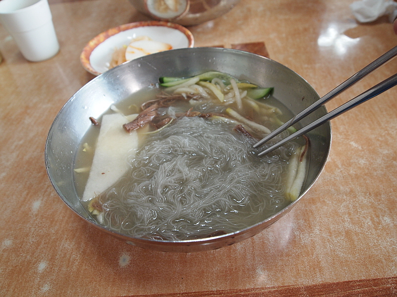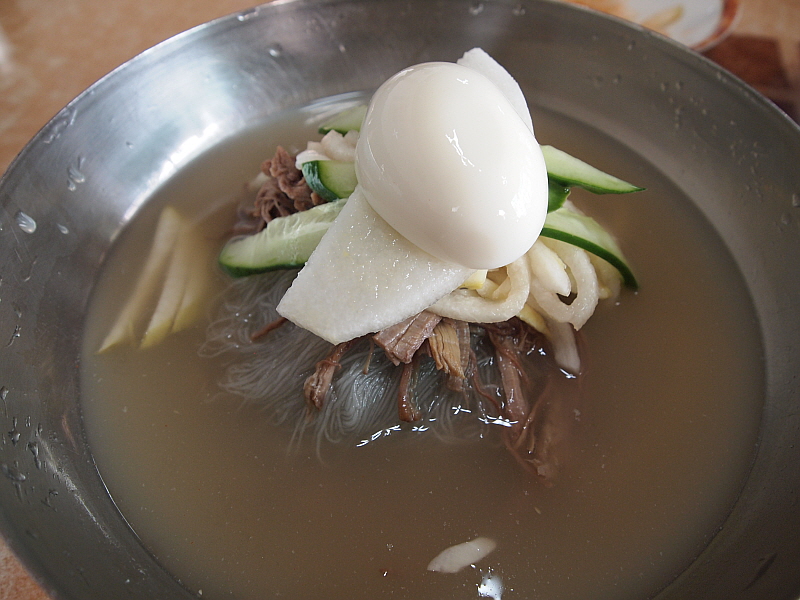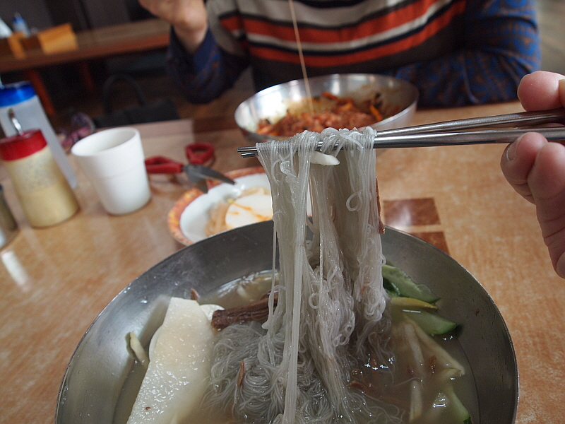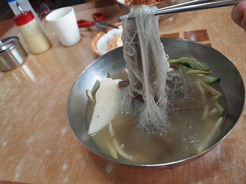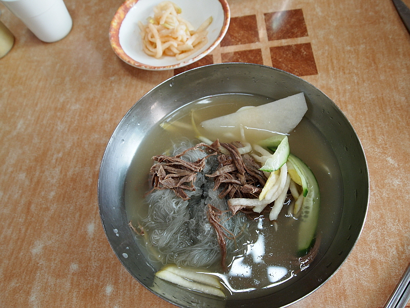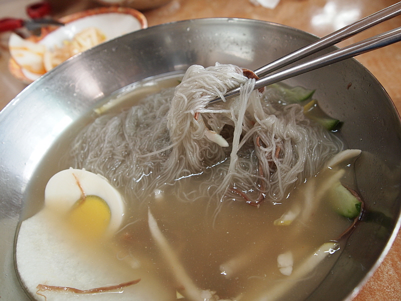 특히나 내 물냉면은 차가운 육수에 쫄깃한 면이 담겨 있어 더 심하게 질겼다. 아무리 젖가락으로 휘휘 저어도 도무지 이 면발이 풀릴 생각을 하지 않았다. 어쩔 수 없다. 그냥 도구의 힘을 빌려야 한다. 물냉면의 육수는 정말 훌륭한 것이었다. 아마 내가 먹어본 함흥냉면 집 중에서는 정말 다섯 손가락 안에 들 정도로 내공있고 깊은 맛이 나는 육수였다. 아마도 소고기와 동치미를 섞은 것 같은데 그 맛이 정말 전문가의 손길이 느껴지는 것이었다.