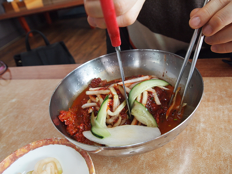 분명 없어진 동천면옥과는 뭔가 관계가 있는 집이라는 생각이 들었다. 형제지간 이거나 집안이거나 아무튼 이렇게 똑 같은 비주얼은 나오기 힘들기 때문에 기술을 이전한 것이 분명했다. 맛을 보니 그런 생각이 더 강하게 들었다. 분명 비슷한 맛이었다. 물론 이집이 더 깊은 내공이 있었다. 하긴 동천면옥도 맛이 훌륭했었다. 마눌의 회냉면에 들어간 가자미의 간이 좀 신맛이 강했다는 점은 아쉬운 부분이지만 그래도 건더기도 많고 맛이 좋았다. 함흥냉면의 면은 정말 쫄깃한 것이 특징이다. 평양냉면과 가장 큰 차이를 보이는 부분일 것이다. 도저히 내 이빨로도 그냥 끊어 먹기가 쉽지 않았다. 냉면을 좋아하는 사람들 중에는 냉면에 가위질을 하는 것을 무슨 큰 잘못이라도 하는 것처럼 생각하는 사람들도 있지만 수월하게 먹기 위해 우리는 과감하게 가위질을 했다.